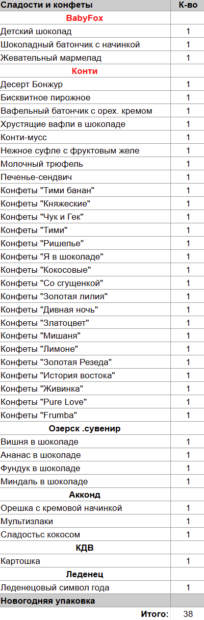 Детский шоколадный набор (1 шт), Шоколадный батончик с начинкой (1 шт), Жевательный мармелад (1 шт), Десерт Бонжур (1 шт),Бисквитное пирожное (1 шт), Вафельный батончик с орех. кремом (1 шт), Хрустящие вафли в шоколаде (1 шт), Конти-мусс (1 шт), Нежное суфле с фруктовым желе (1 шт), Молочный трюфель (1 шт), Печенье-сендвич (1 шт), Вишня в шоколаде (1 шт), Ананас в шоколаде (1 шт), Фундук в шоколаде (1 шт), Миндаль в шоколаде (1 шт), Десерт с кремовой начинкой (1 шт), Мультизлаки (1 шт), Сладость с кокосом (1 шт), Картошка (1 шт), Леденецовый символ года (1 шт)