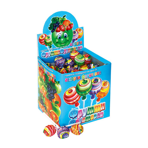 Карамель на палочке "Фрутти" можно купить оптом с доставкой по Москве, Подмосковью и ЦФО. Низкая цена обусловлена отсутствием посредников при наличии прямого договора с производителем. Все актуальные сертификаты в наличии. Минимальный заказ: 1 коробка