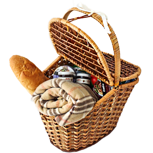 Состав: корзина с крышкой, хлеб, плед, семечки, 3 паштета разных вкусов, 3 конфитюра, спрей от комаров, влажные салфетки
