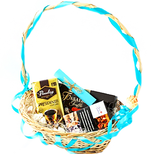 Состав: корзина, кофе натуральный жареный молотый, Бабаевский трюфель, сахар карамельный, декор и поздравление речному и морскому флоту.
