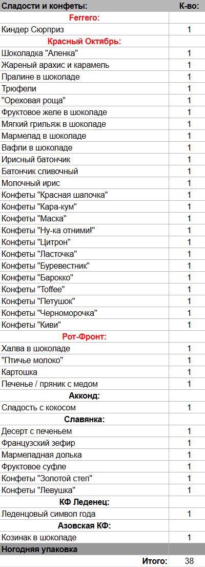 Киндер Сюрприз (1 шт), Шоколадка "Аленка" (1 шт), Жареный арахис и карамель (1 шт), Пралине в шоколаде (1 шт), Трюфели (1 шт), "Ореховая роща" (1 шт), Фруктовое желе в шоколаде (1 шт), Мягкий грильяж в шоколаде (1 шт), Мармелад в шоколаде (1 шт), Вафли в шоколаде (1 шт), Ирисный батончик (1 шт), Батончик сливочный (1 шт), Молочный ирис (1 шт), Халва в шоколаде (1 шт), "Птичье молоко" (1 шт), Картошка (1 шт), Печенье / пряник с медом (1 шт), Сладость с кокосом (1 шт), Десерт с печеньем (1 шт), Французский зефир (1 шт), Мармеладная долька (1 шт), Фруктовое суфле (1 шт), Леденцовый символ года (1 шт), Козинак в шоколаде (1 шт)