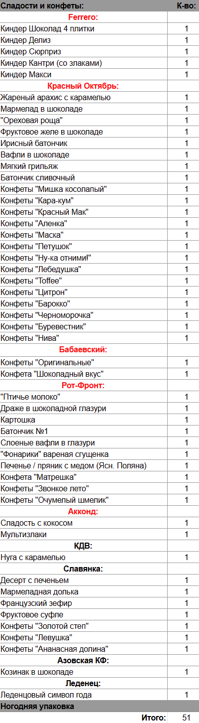 Киндер Шоколад 4 плитки (1 шт), Киндер Делиз (1 шт), Киндер Сюрприз (1 шт), Киндер Кантри (со злаками) (1 шт), Киндер Макси (1 шт), Жареный арахис с карамелью (1 шт), Мармелад в шоколаде (1 шт), "Ореховая роща" (1 шт), Фруктовое желе в шоколаде (1 шт), Ирисный батончик (1 шт), Вафли в шоколаде (1 шт), Мягкий грильяж (1 шт), Батончик сливочный (1 шт), "Птичье молоко" (1 шт), Драже в шоколадной глазури (1 шт), Картошка (1 шт), Батончик №1 (1 шт), Слоеные вафли в глазури (1 шт), "Фонарики" вареная сгущенка (1 шт), Печенье / пряник с медом (1 шт), Сладость с кокосом (1 шт), Мультизлаки (1 шт), Нуга с карамелью (1 шт), Десерт с печеньем (1 шт), Мармеладная долька (1 шт), Французский зефир (1 шт), Фруктовое суфле (1 шт), Козинак в шоколаде (1 шт), Леденцовый символ года (1 шт)