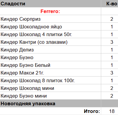 Киндер Шоколадное яйцо (1 шт), Киндер Шоколад 4 плитки 50 гр. (1 шт), Киндер Делиз (1 шт), Киндер Сюрприз (2 шт), Киндер Кантри (со злаками) (3 шт), Киндер Макси 21 гр. (3 шт), Киндер Буено (1 шт), Киндер Буено Белый (1 шт), Киндер Шоколад 8 плиток 50 гр. (1 шт), Киндер Шоколад мини (2 шт), Киндер Буэно мини (2 шт)